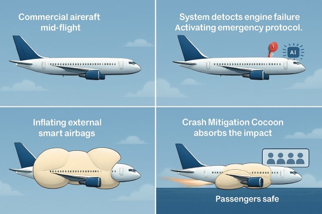 A four-stage diagram showing how the airbags would deploy around an aircraft in an emergency (Picture: Project Rebirth/AI)