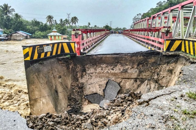 Condition of a bridge cut off by flooding in North Tapanuli Regency,North Sumatra